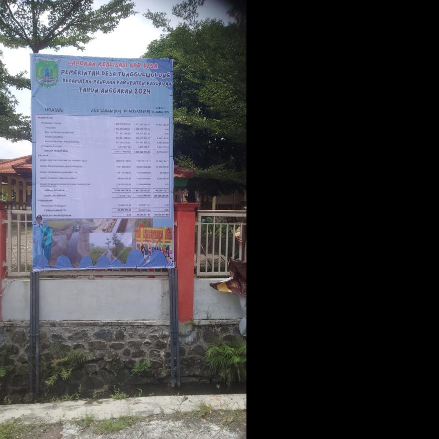 Dalam upaya meningkatkan transparansi tata kelola keuangan desa, Pemerintah Desa Tunggulwulung telah memasang papan informasi publik yang memuat Laporan Realisasi APBDes Tahun Anggaran 2024, serta Anggaran Pendapatan dan Belanja Desa (APBDes) 2025 dan Perubahan APBDes (P-APBDes) 2025.